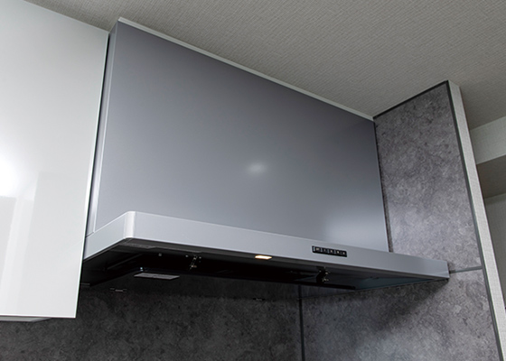 パワフルに煙や熱を吸引・排出するシロッコファン型のレンジフード。整流板はお手入れがスムーズな高品位ホーロー製です。