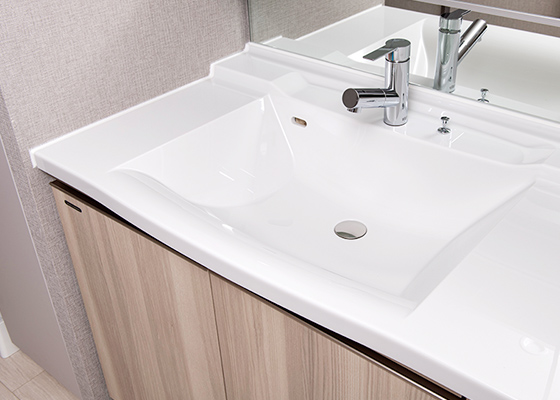 洗面ボウル一体型の人工大理石ワークトップ。いつも清潔に使えます。